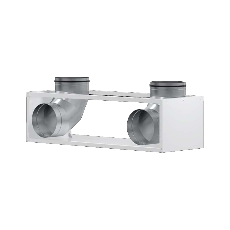 Speciális légtechnikai adapter az LTM 300-as gépekhez, amely lehetővé teszi a levegő be- és kivezetését 90 fokos szögben, ha a gép elhelyezése ezt igényli (pl. ablakpárkány alatt).